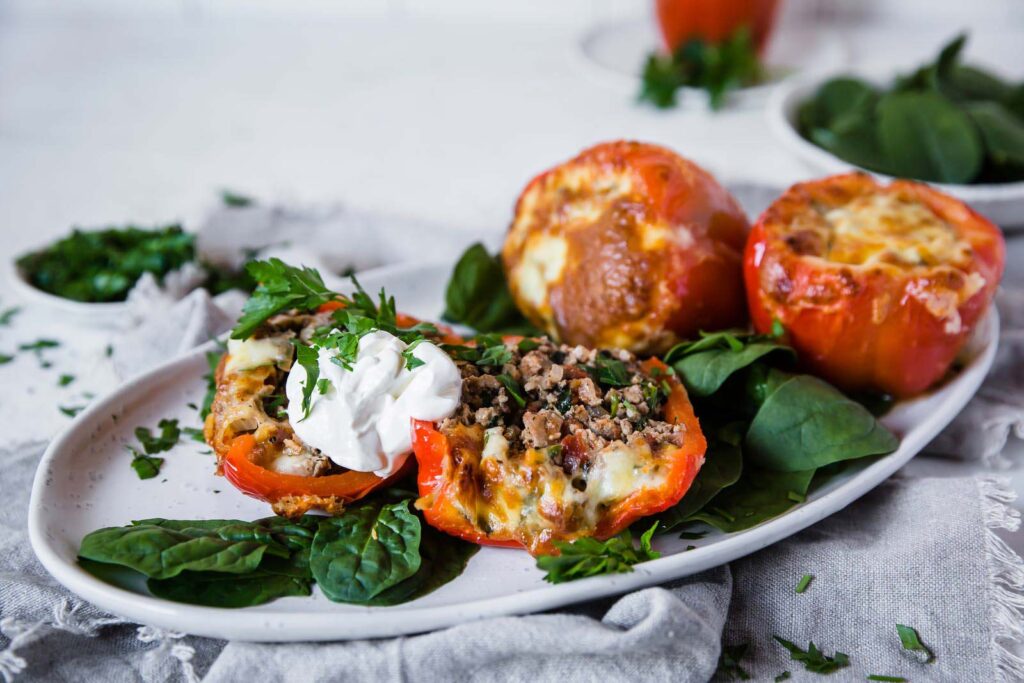 4 servings Ingredients Stuffed bell peppers 4 red bell peppers, 5-6 oz. each 2 tbsp olive oil 110 g yellow onions, finely chopped 3 garlic
