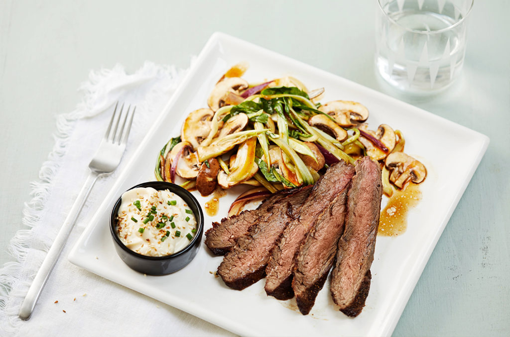 Flank steak with mushroom salad & sesame mayo