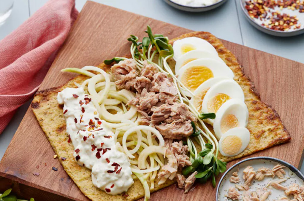Wrap it up! Exactly what goes inside our gluten-free and low-carb flatbread? You decide! We showcase a tasty combo of tuna, eggs, and cottage cheese with