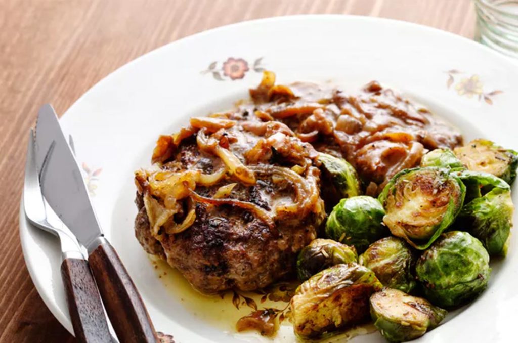 Hamburger patties with onions & brussels sprouts