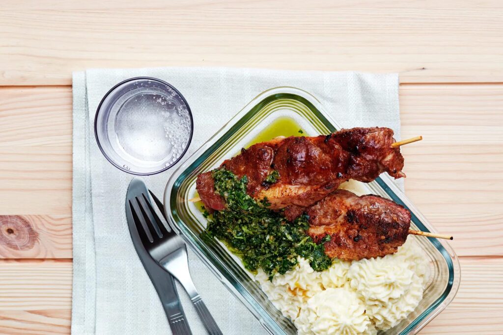 Keto pork skewers with cauliflower mash and chimichurri. A quick and easy-to-make keto lunch or dinner, also great your weekly for meal prep. You can